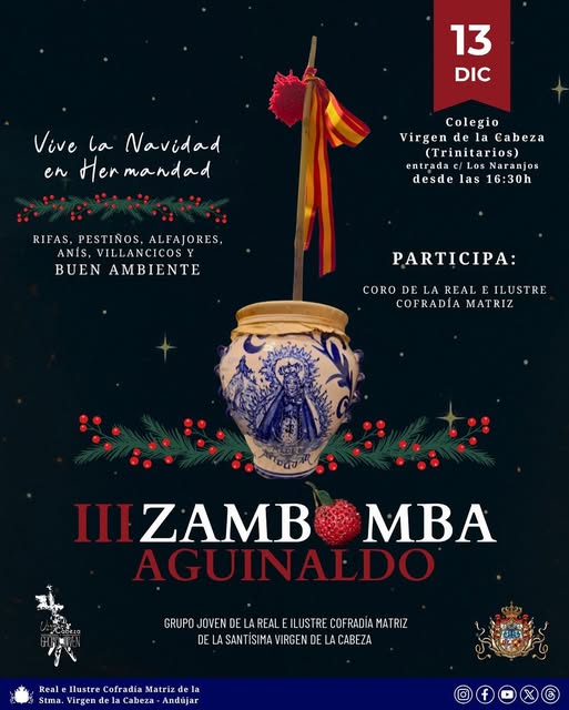 La Real e Ilustre Cofradía Matriz de la Santísima Virgen de la Cabeza, a través de su Vocalía de Juventud, te invita a vivir la III Zambomba Aguinaldo organizada por nuestro Grupo Joven ![]()