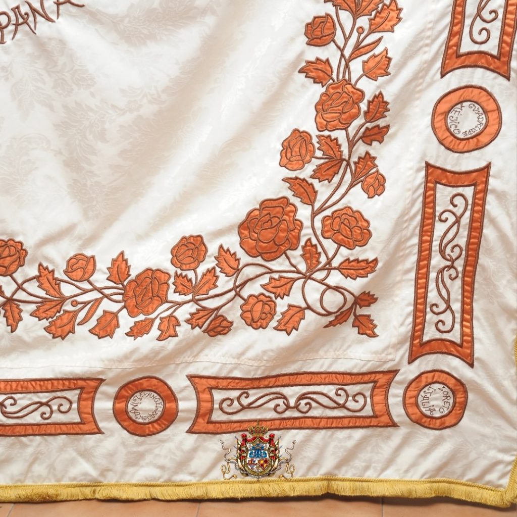 Se trata de un paño bicolor de dos metros y medio de lado, en amarillo albero y blanco roto, que representan los colores de la bandera vaticana, bordada toda su decoración en la técnica de repostero y el centro con la representación de la propia “Rosa de Oro”, bordada en oro fino y plata fina a realce.