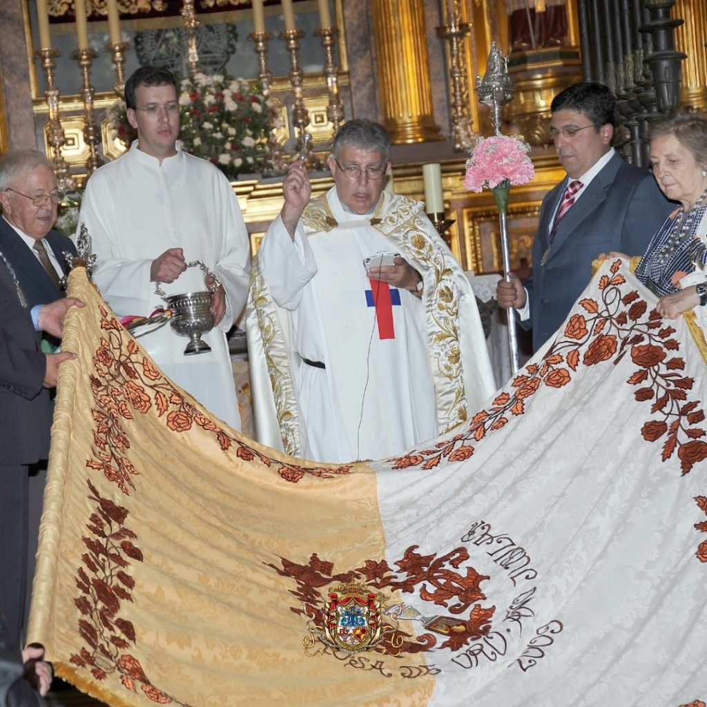 Foto 3: Bendición de la Bandera Rosa de Oro en agosto de 2012 por parte del Rector del Santuario, el Padre Domingo Conesa y siendo Hermano Mayor José Carlos Millán.