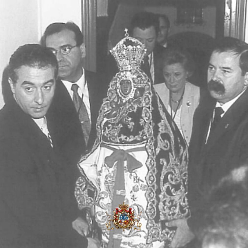 Foto 1: Bajada del año 2000. Aparecen, en primer término, Antonio Cuenca, Alcalde de Andújar; Miguel Corpas Gómez, Presidente de la Cofradía Matriz; Francisco López Jábega, Hermano Mayor; María del Carmen de Torres Puentes, y José María Garrido Ramos, Diputados; y Luis Felipe Moreno del Castillo, Secretario.