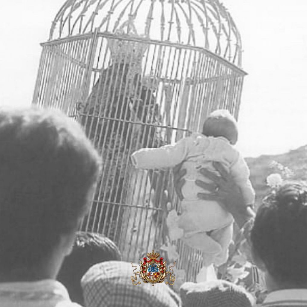 Foto 3: Subida de la Virgen de la Cabeza, 14 de octubre del año 2000. Entronizada en su célebre «Jaula», por el Camino Viejo. Un bebé le es acercado a su vera, para que Ella lo bendiga.