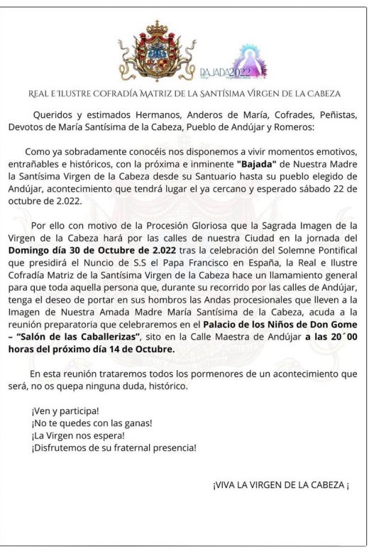 𝗖𝗢𝗡𝗩𝗢𝗖𝗔𝗧𝗢𝗥𝗜𝗔 𝗔𝗦𝗔𝗠𝗕𝗟𝗘𝗔 𝗠𝗔𝗚𝗡𝗔 𝗣𝗥𝗢𝗖𝗘𝗦𝗜𝗢́𝗡 Queridos y estimados Hermanos, Anderos de María, Cofrades, Peñistas, Devotos de María …