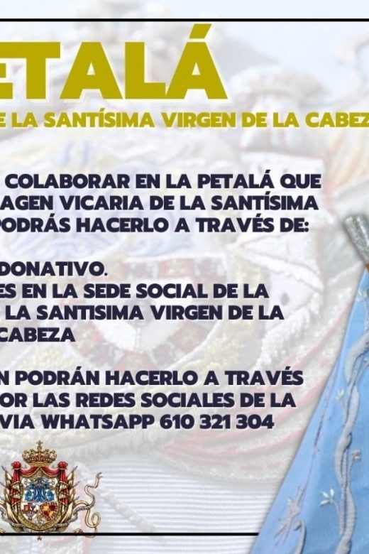 PETALÁ 𝐚 𝐥𝐚 𝐢𝐦𝐚𝐠𝐞𝐧 𝐕𝐢𝐜𝐚𝐫í𝐚 𝐝𝐞 𝐥𝐚 𝐒𝐚𝐧𝐭í𝐬𝐢𝐦𝐚 𝐕𝐢𝐫𝐠𝐞𝐧 𝐝𝐞 𝐥𝐚 𝐂𝐚𝐛𝐞𝐳𝐚. Petalá a la Virgen de la Cabeza Si quieres participar y colaborar en la petalá que se realizará a la imagen vicaría de la …Continuar Leyendo acerca de PETALÁ 𝐚 𝐥𝐚 𝐢𝐦𝐚𝐠𝐞𝐧 𝐕𝐢𝐜𝐚𝐫í𝐚 𝐝𝐞 𝐥𝐚 𝐒𝐚𝐧𝐭í𝐬𝐢𝐦𝐚 𝐕𝐢𝐫𝐠𝐞𝐧 𝐝𝐞 𝐥𝐚 𝐂𝐚𝐛𝐞𝐳𝐚.