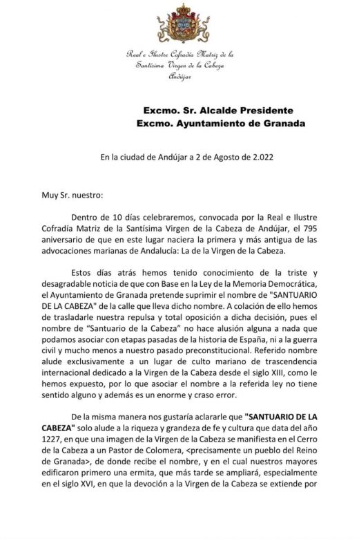La Real e Ilustre Cofradía Matriz de la Santísima Virgen de la Cabeza, remite la carta que se adjunta al Excelentísimo …