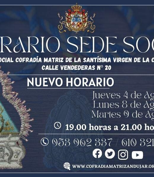 𝐍𝐔𝐄𝐕𝐎 𝐇𝐎𝐑𝐀𝐑𝐈𝐎 𝐒𝐄𝐃𝐄 𝐒𝐎𝐂𝐈𝐀𝐋. La sede social de la Real e Ilustre Cofradía Matriz de la Santísima Virgen de la Cabeza, situada en …