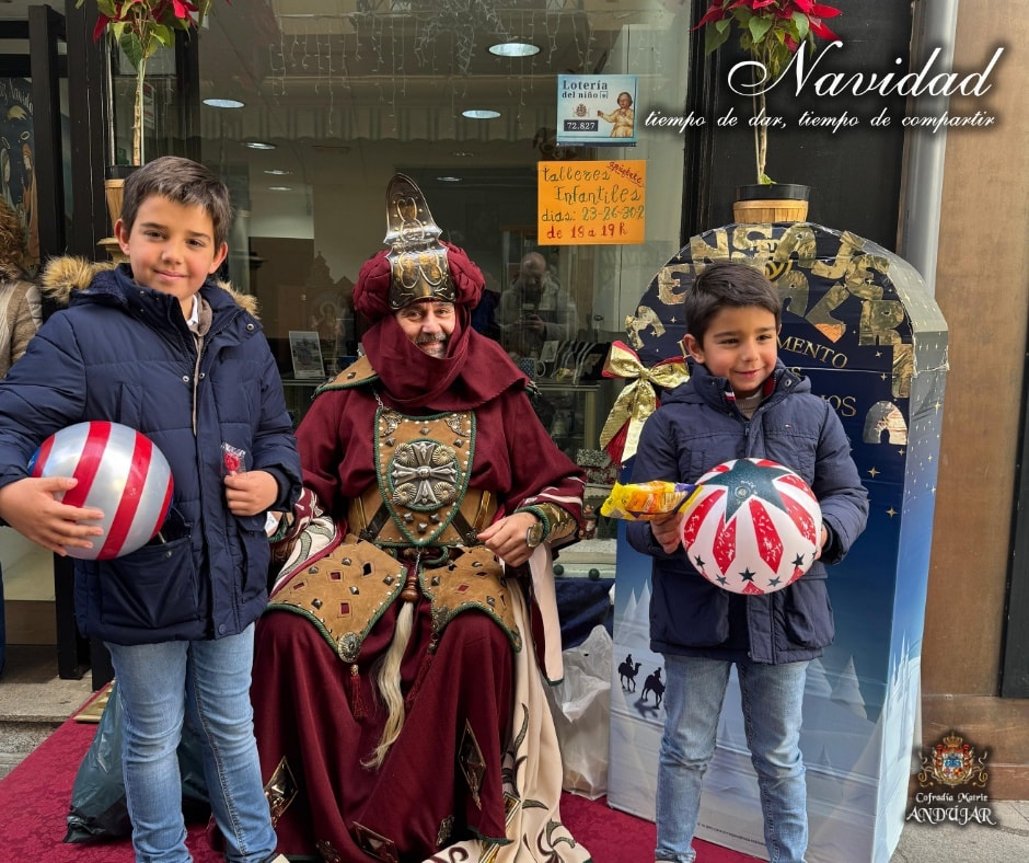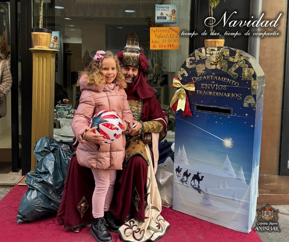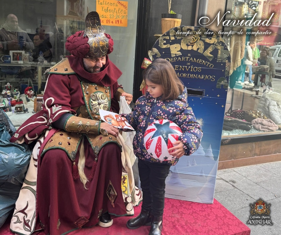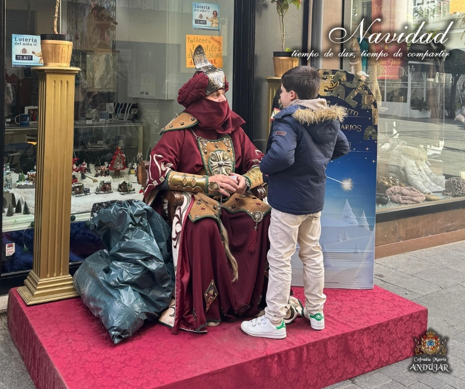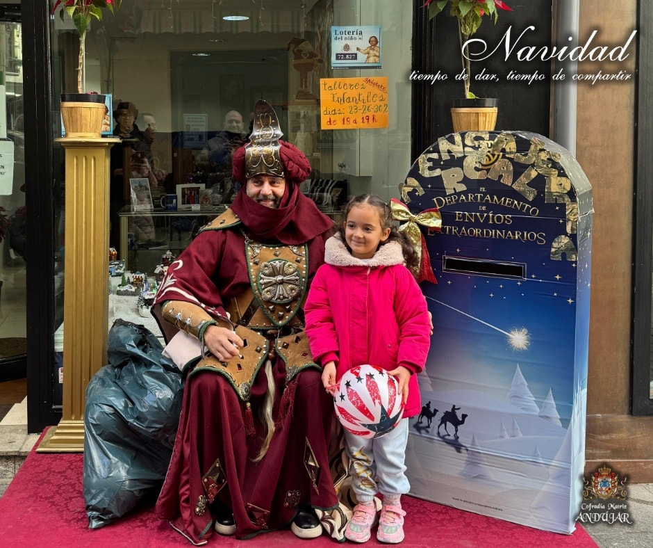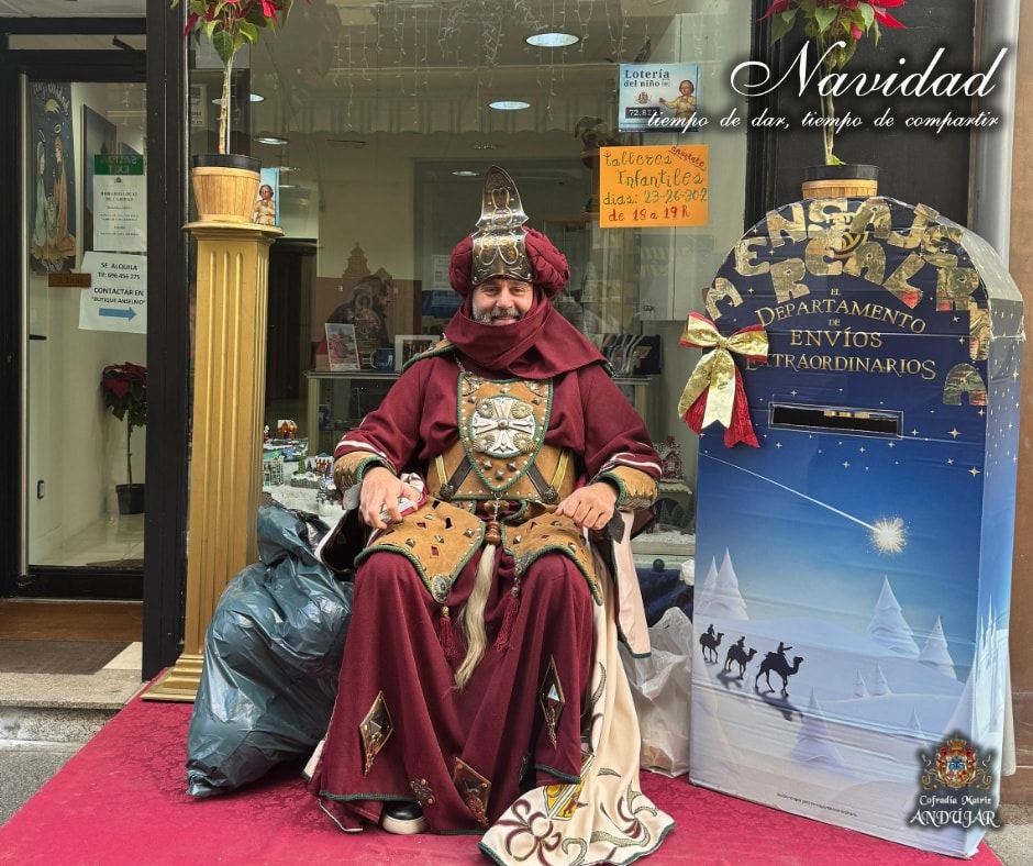 En la maรฑana de hoy hemos recibido la visita del Cartero Real de sus Majestades los Reyes de Oriente en nuestro local de caridad. Los niรฑos de Andรบjar han podido depositar su carta en el bozรณn y hablar con el emisario para pedir sus deseos.