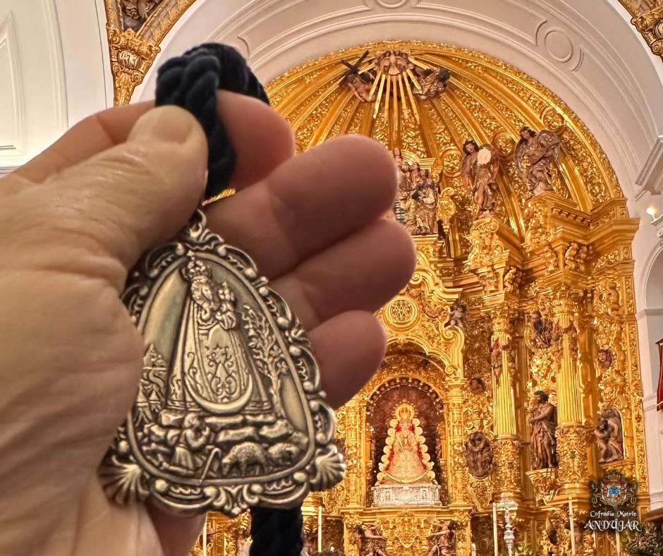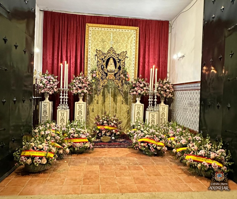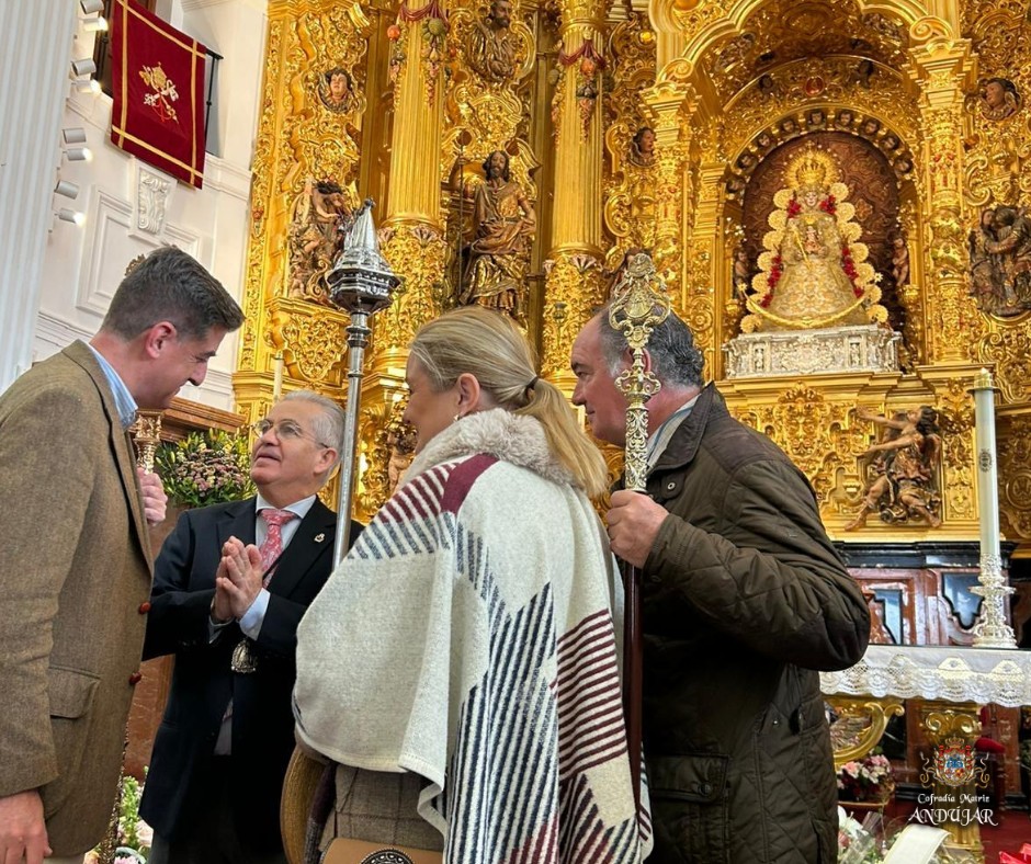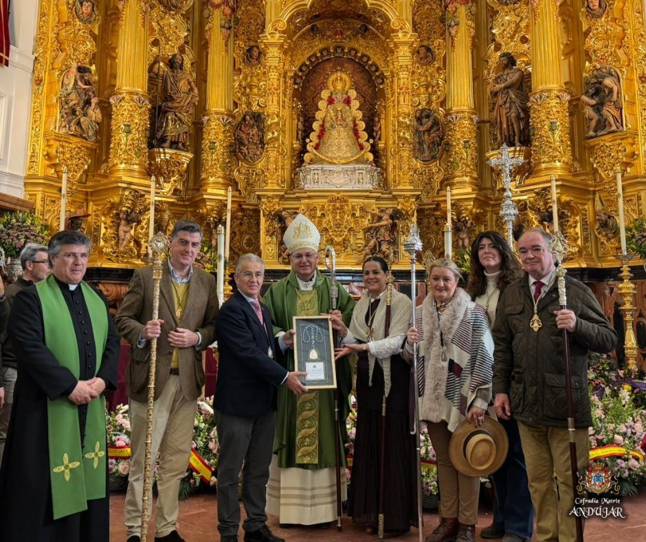 La Cofradรญa Matriz ofrendรณ a la Virgen de El Rocรญo una cesta de flores y, al finalizar la Eucaristรญa, se hizo entrega de nuestra medalla a la Hermandad de El Rocรญo en Jaรฉn, estando presente el presidente de la Hermandad Matriz de Almonte, con quiรฉn tuvimos un posterior encuentro.