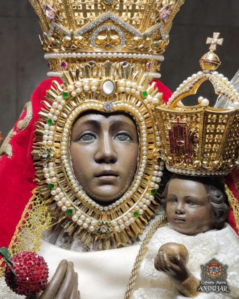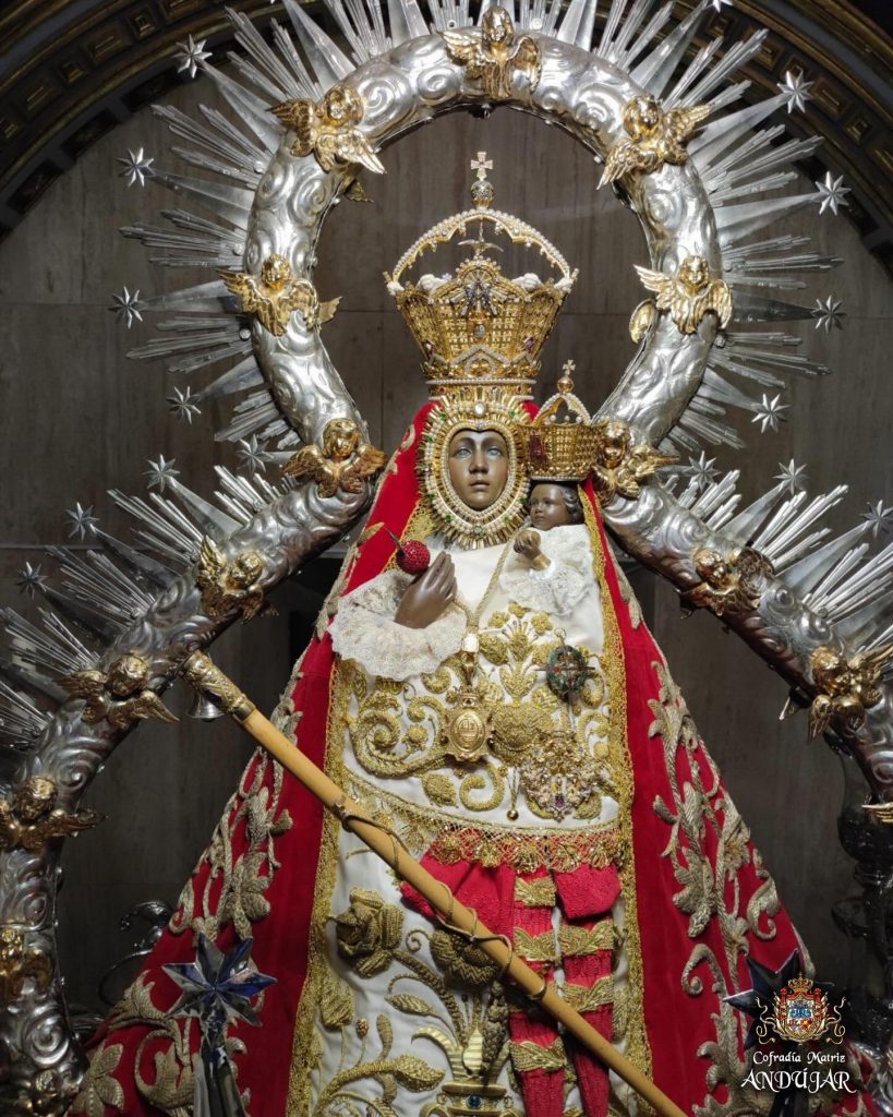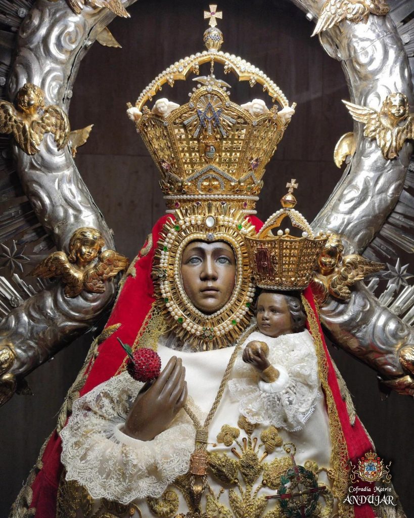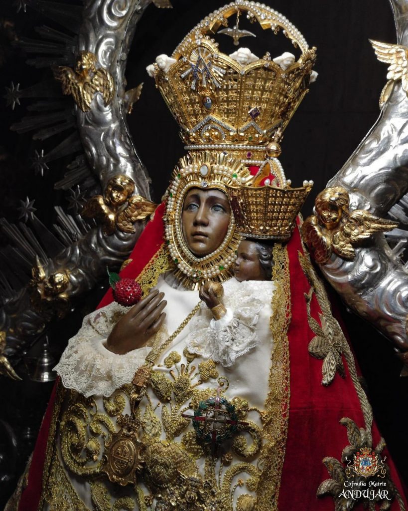 Lleva impuestas las insignias y honores que la Santa Sede, el Reino de Espaรฑa y su pueblo de Andรบjar le han ofrecido a lo largo de los aรฑos.