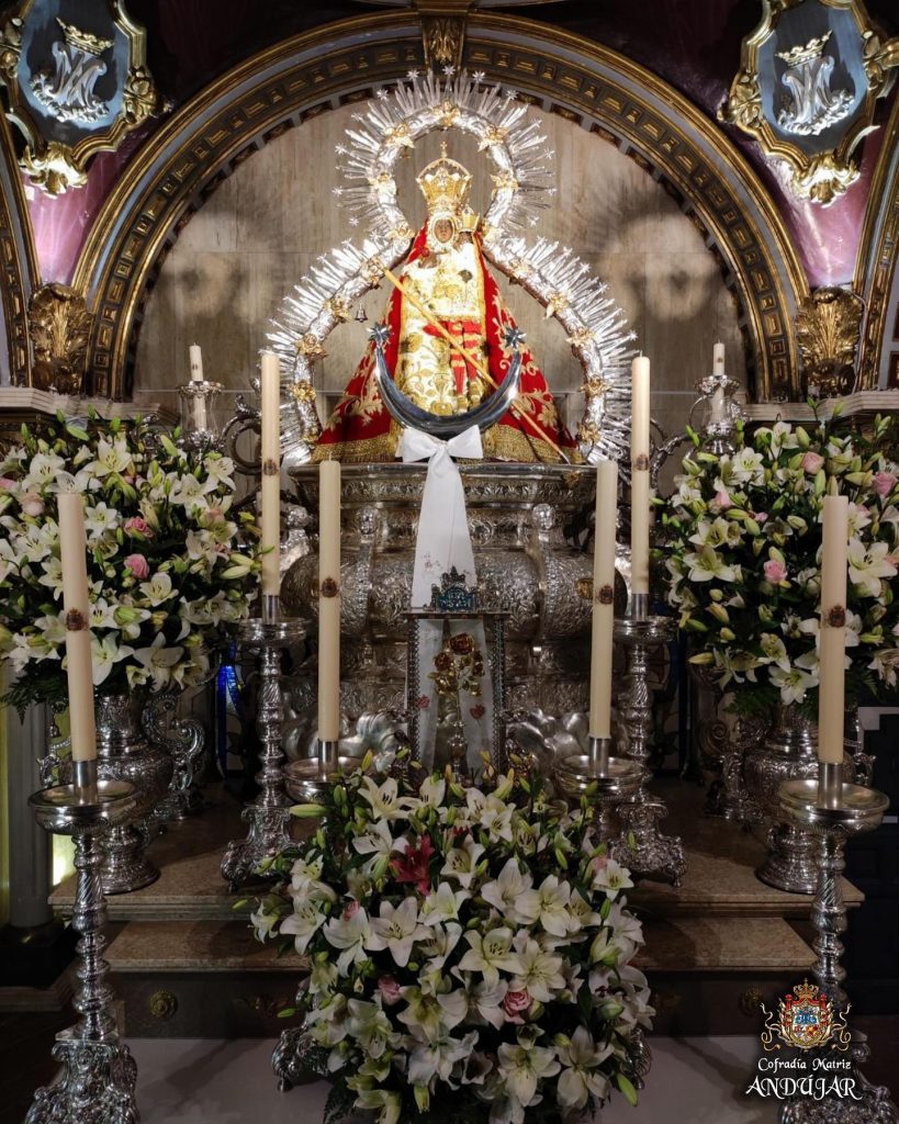 Para esta ocasiรณn tan especial, nuestra Hermana Mayor Isabel Barrios, ha vestido a la Santรญsima Virgen de la Cabeza con su manto de terciopelo rojo emperatriz bordado en oro fino, ofrendado a nuestra Patrona en 1961 por el Hermano Mayor Lรกzaro Palomares.