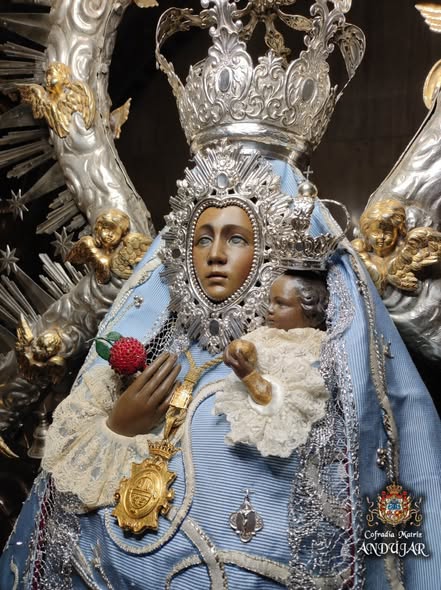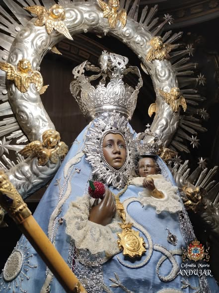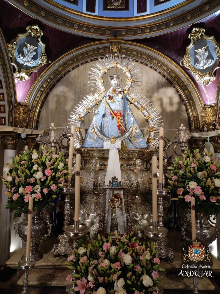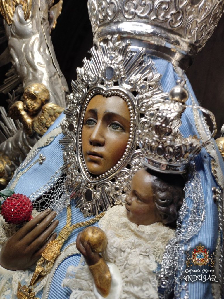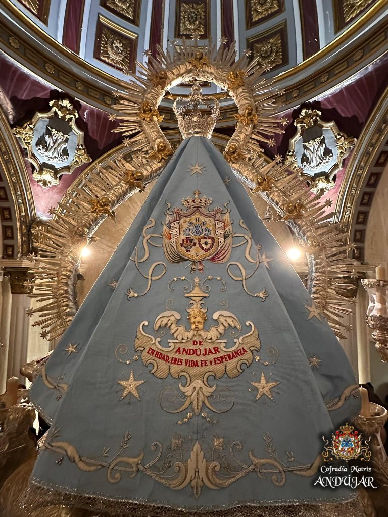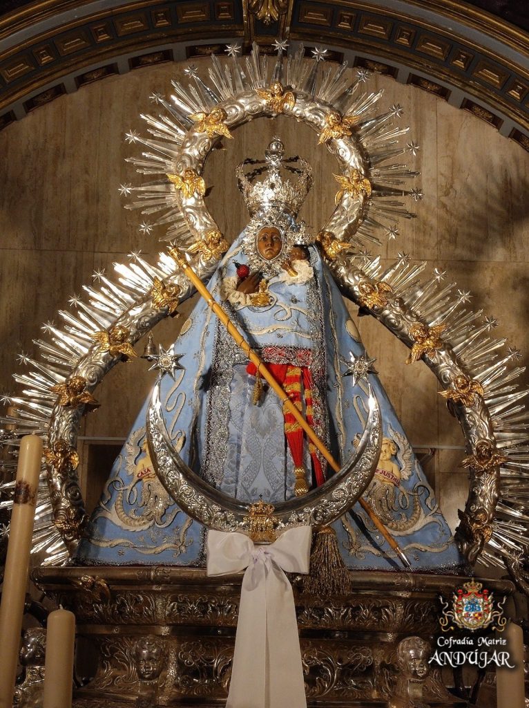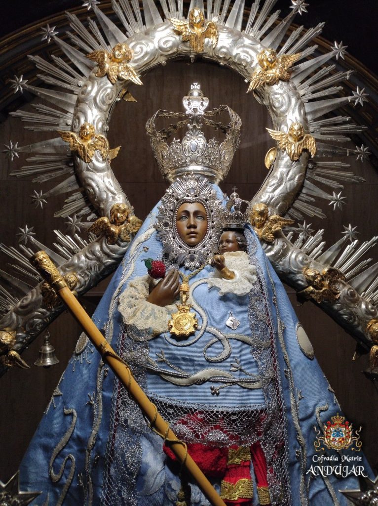 La Santísima Virgen, en su pureza concebida, lleva solo impuesta la medalla y bastón de Patrona y Alcaldesa de la Ciudad de Andújar y ceñido el fajín de Capitana General de los Ejércitos del Reino de España. Estrena medalla de plata del Santísimo Cristo de la Luz, donada a la Cofradía Matriz por la Hermandad del Santísimo Cristo de la Luz de Dalías (Almería) para nuestra Sagrada Titular.