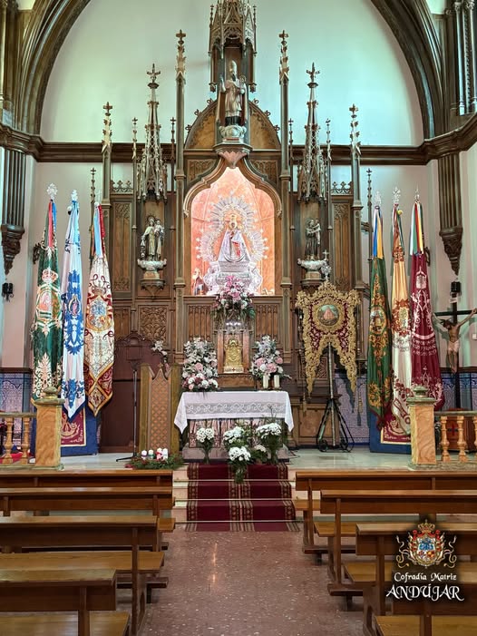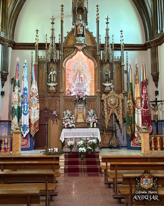 Para ello, la Vocalía de Patrimonio ha montado en el altar el Estandarte, junto con las Banderas, para que presidan junto a la Imagen Vicaria de la Santísima Virgen de la Cabeza en la Ermita de la Calle Ollerías.